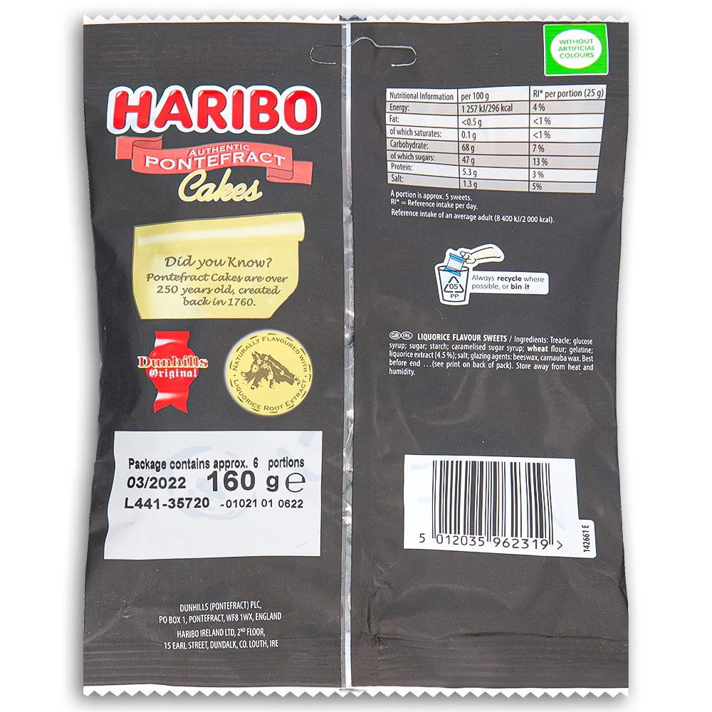 Haribo Pontefract Cakes are a type of small, roughly circular black sweet measuring approximately 2 cm in diameter and 4 mm thick. They are made of liquorice, and originated in the Yorkshire town of Pontefract, England. This delightful treat will leave you craving more.